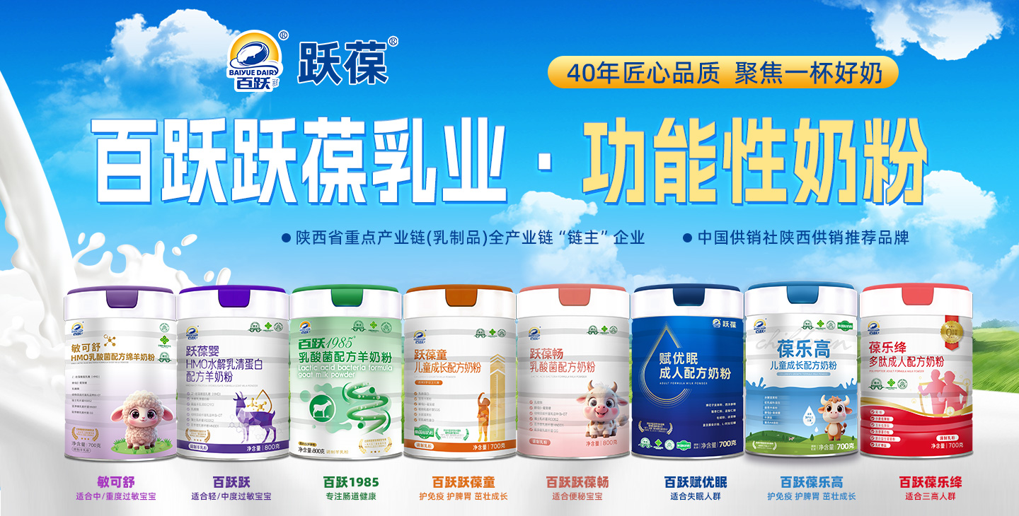 西安百躍躍葆乳業(yè)有限公司,是西安百躍羊乳集團(tuán)有限公司旗下控股子公司,專注于功能性特種乳粉的研發(fā)、生產(chǎn)、銷售及服務(wù)。作為乳制品行業(yè)資深企業(yè)百躍集團(tuán)的新銳力量,躍葆乳業(yè)依托母公司40余年羊乳制品生產(chǎn)經(jīng)驗(yàn)及全產(chǎn)業(yè)鏈優(yōu)勢(shì),采用國際先進(jìn)生產(chǎn)工藝和檢測技術(shù),致力于為消費(fèi)者提供鮮醇、營養(yǎng)、健康、好喝的乳粉產(chǎn)品。