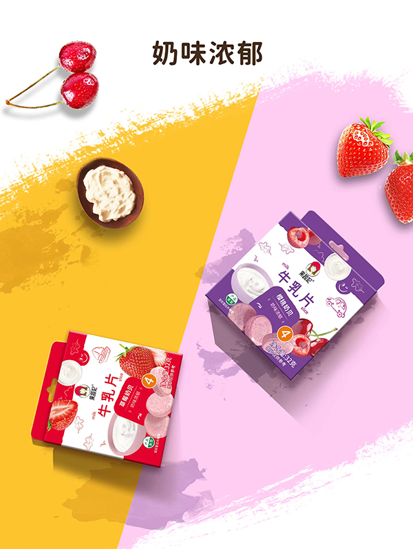 果蔬妃【水果牛乳片】堅(jiān)守安全配方,選用凍干果粉和全脂乳粉,不含白砂糖,奶味濃郁,口味清甜!創(chuàng)新小盒,獨(dú)立包裝,方便攜帶,有櫻桃、草莓兩種口味。