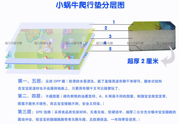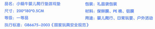 小蝸牛爬行墊無毒無味,防潮隔濕,超大無縫,表面附帶精美的童話圖案,從寶寶學(xué)爬到練習(xí)走路,再到大點(diǎn)在地上玩耍蹦跳,都是不錯的選擇,是寶寶健康快樂成長的好伴侶。