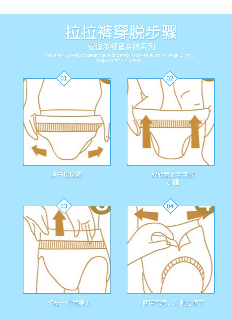 3、內(nèi)置棉韌雙層吸收芯層,可瞬間吸收并鎖住自身重量30倍的水分,快速吸收排濕,干爽、透氣、不留尿漬,雙層防漏側(cè)圍緊致防漏。