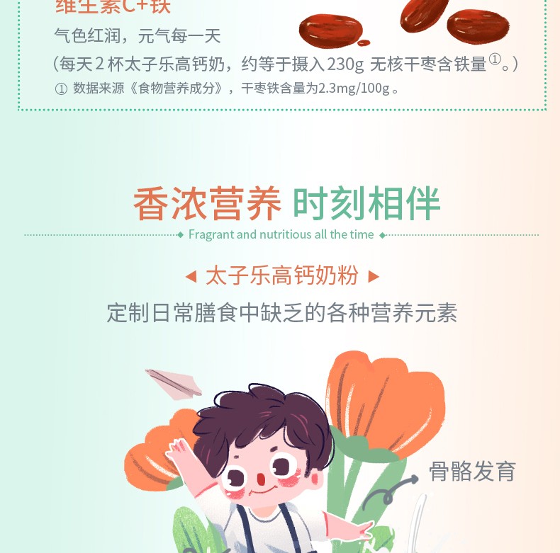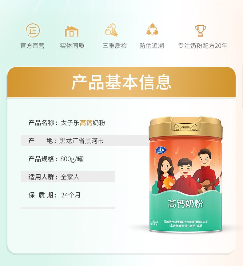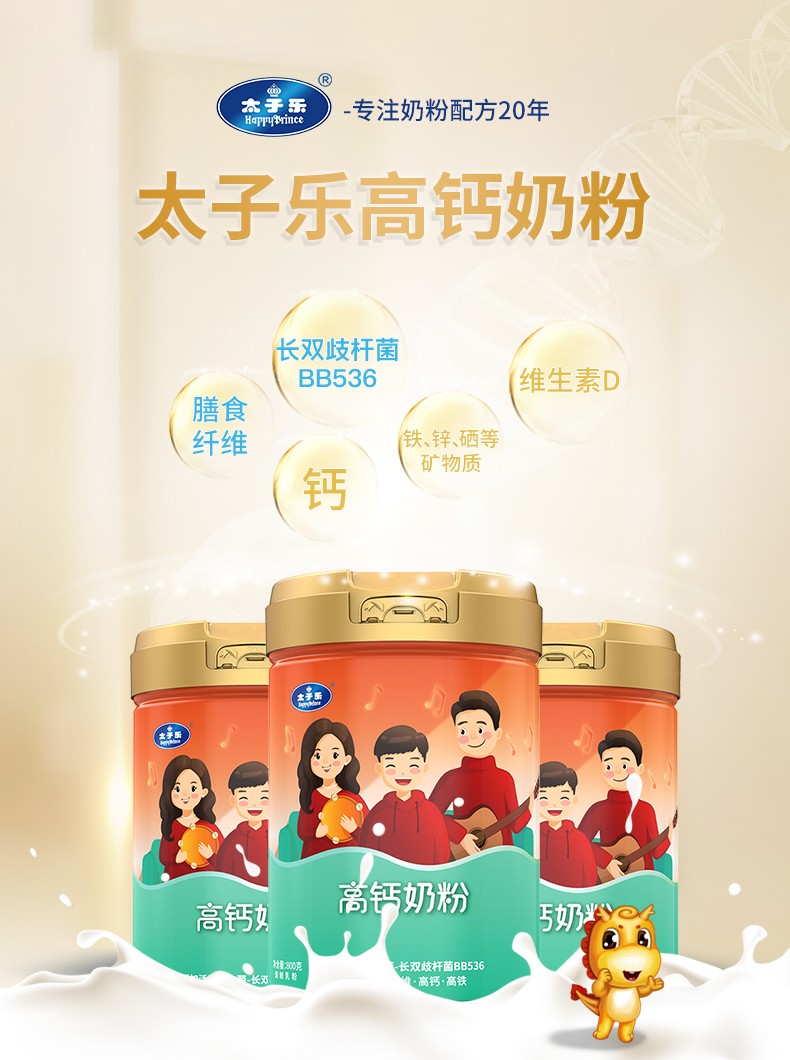 太子樂(lè)高鈣奶粉定制日常膳食中缺乏的各種營(yíng)養(yǎng)元素,長(zhǎng)雙歧桿菌BB536、鈣、硒、膳食纖維等,科學(xué)配比鈣含量,滿足全家營(yíng)養(yǎng)所需。