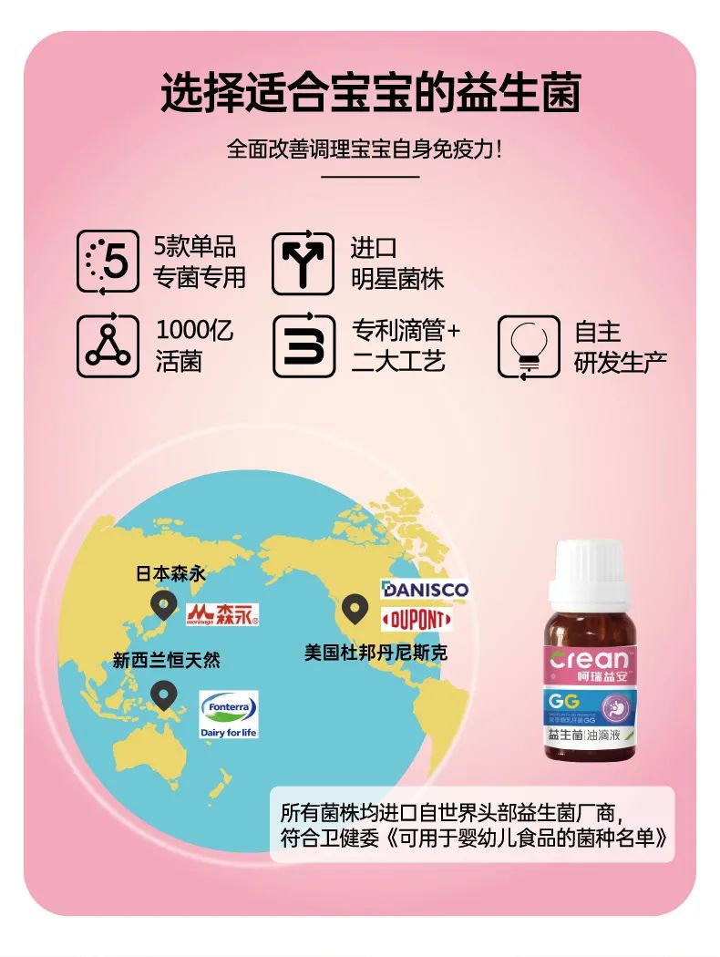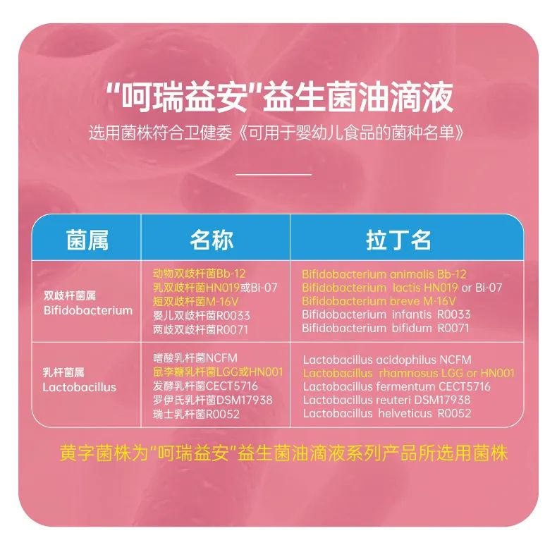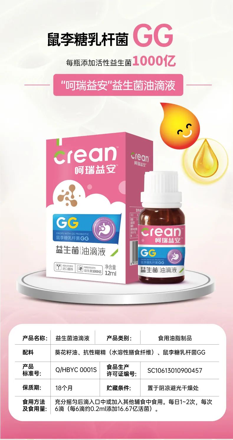 呵瑞益安鼠李糖乳桿菌GG益生菌油滴液,采用進口菌株,且選用菌株符合衛(wèi)健委【可用于yingye食品的菌種名單】。添加進口原料,如瑞典AAK進口油脂及進口水溶性膳食纖維,安全配方,自主研發(fā)生產,每瓶添加1000億活性益生菌,專利滴管,精準控量,油滴嵌入包裹工藝+全程充氮;罟に,牢牢鎖定活性。