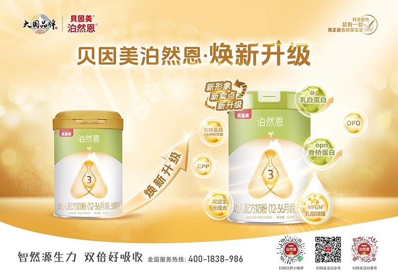 各位寶媽注意啦!貝因美泊然恩嬰幼兒配方奶粉煥新升級咯!新形象超亮眼,冠蓋是和桶身同色系的綠色,凸顯產(chǎn)品生機活力的形象,密封性和保鮮性也更好了。