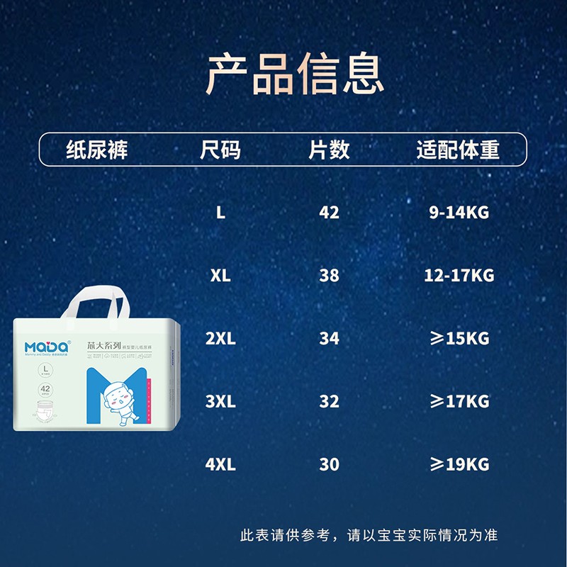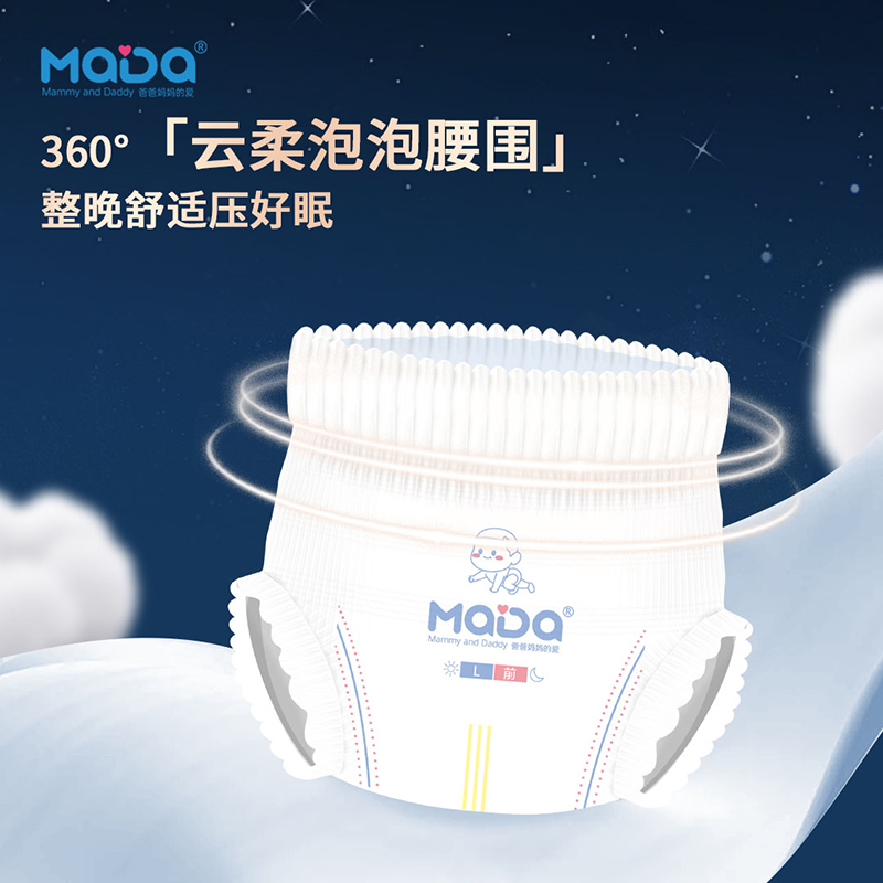MaDa芯大系列褲型嬰兒紙尿褲,芯大20%,不漏好安心。薄若蟬翼,隔濕透氣,泡點觸膚,干爽舒適,云朵腰圍,柔軟不勒,芯體加寬,瞬吸瞬干。