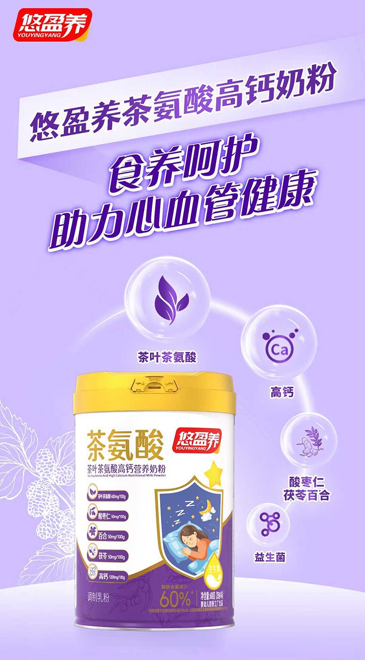 悠盈養(yǎng)茶葉茶氨酸高鈣營養(yǎng)奶粉,根據(jù)中老年健康營養(yǎng)需求精心研發(fā)配方,添加生牛乳,特別添加茶葉茶氨酸、高鈣、酸棗仁、茯苓、百合、益生菌,食養(yǎng)阿護,助力心血管健康。脂肪含量減少60%,只添營養(yǎng)不添負擔(dān)。