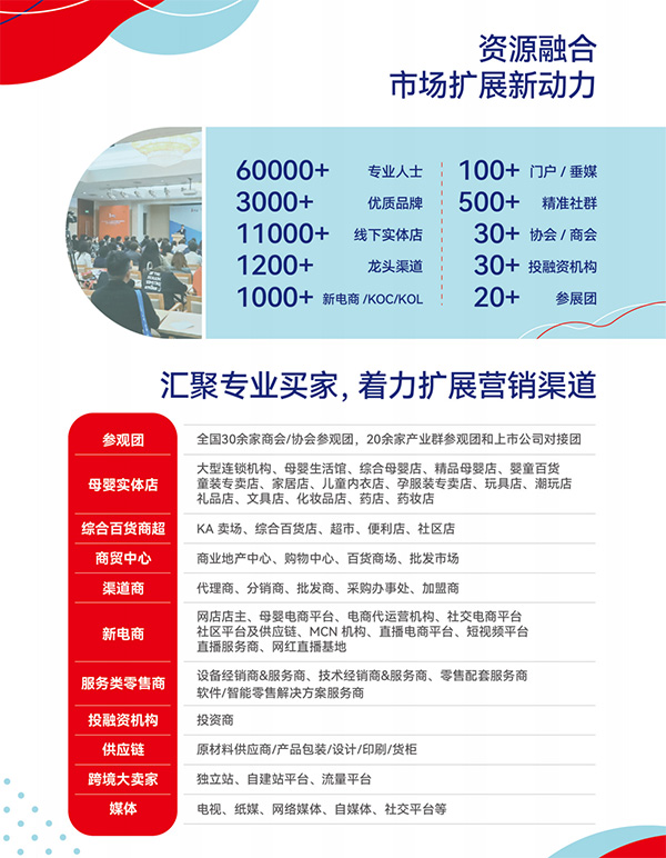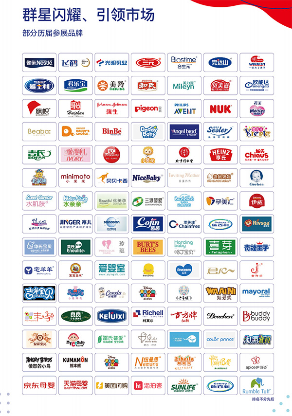 支持單位:中國(guó)優(yōu)生優(yōu)育協(xié)會(huì)、中華醫(yī)學(xué)會(huì)、中國(guó)貿(mào)促會(huì)商業(yè)行業(yè)分會(huì)、全國(guó)婦聯(lián)辦公廳、中國(guó)婦女兒童活動(dòng)中心、中國(guó)關(guān)工委健體中心學(xué)雷鋒聯(lián)盟、全國(guó)衛(wèi)生產(chǎn)業(yè)企業(yè)管理協(xié)會(huì)兒童健康產(chǎn)業(yè)分會(huì)、中國(guó)國(guó)際展覽中心集團(tuán)、《中國(guó)會(huì)展》雜志社、廣東省孕嬰童用品協(xié)會(huì)、云南省孕嬰童用品協(xié)會(huì)、河南省孕嬰童用品行業(yè)協(xié)會(huì)、山東省孕嬰童用品商會(huì)、海南省孕嬰童行業(yè)協(xié)會(huì)、貴州省兒童用品商會(huì)、廣西玩具和嬰童用品協(xié)會(huì)